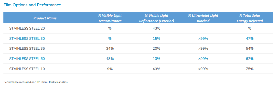 Stainless Steel products have a neutral grey tone that complements any color scheme. They are a perfect solution for improving heat rejection without giving a ‘mirror’ look.