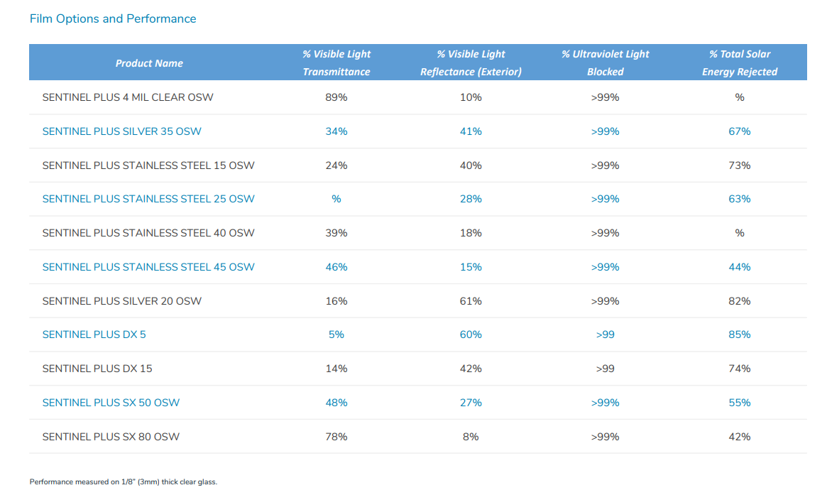 Solar Gard’s range of exterior window films. The Sentinel Plus range includes Stainless Steel, Silver, Clear, and SX.