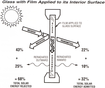- Part of the sun’s energy is absorbed by the window film and part is reradiated in and out of the room.